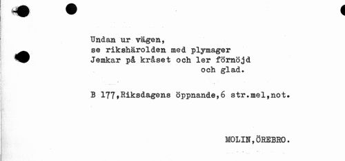 //// w % //// Undan ur vägen, ^^ se rikshärolden med plymager //// Jemkar på kråset och ler förnöjd //// o ch gl ad. //// B 17?fRiksdagens öppnande,6 str.mel,not. //// r» //// MOLIN,ÖREBRO. //// -•k r - ////