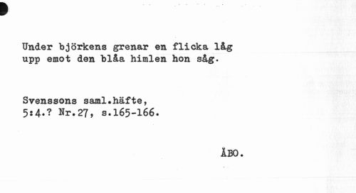 //// ¥ //// Under björkens grenar en flicka låg upp emot den blåa himlen hon såg. //// Svenssons saml.häfte, //// 5«4.? Nr.27, s.165-166. //// ÅBO. ////