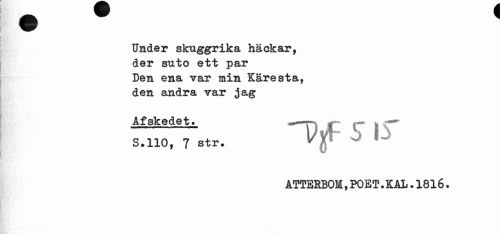 //// Under skuggrika häckar, der suto ett par Den ena var min Käre sta, den andra var jag //// Af skedet ? < -r t g- I //// S.110, 7 str. vKr ^ f~ //// ATTERBOM,POET.KAL.1816. ////