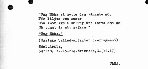//// "Ung Ebba så hette den vänaste mö, För liljor och rosor //// Hon swor sin älskling att lefva och dö Så tungt är att svikas //// »Ung Ebba," //// (Enstaka balladvarianter o•-fragment) Sdml.Ärila, //// 347:48, s.213-214*Ericsson,G*(bd.17) //// ULMA. ////