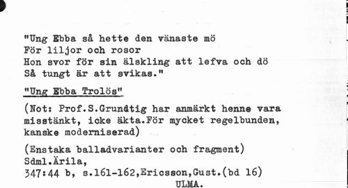 //// w ¦ //// r //// I ¦ //// f,Ung Ebba så hette den vänaste mö För liljor och rosor //// i //// Hon svor för sin älskling att lefva och dö //// Så tungt är att svikas." j //// i //// "Ung Ebba Trolös'1 ; //// (Not: Prof.S.Grundtig har anmärkt henne vara misstänkt, icke äkta.För mycket regelbunden, \ //// kanske moderniserad) //// i | //// i //// (Enstaka balladvarianter och fragment) Sdml.Ärila, //// 347:44 b, s.l6l-l62,Ericsson,Gust.(bd 16) //// ULMA. ////