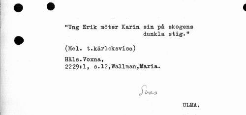 //// "Ung Erik möter Karin sin på skogens ^^ dunkla stig." //// (Me1. t.kärlek svi sa) Häls.Voxna, //// 2229:1t s.12,Wallman,Maria. //// J //// ULMA. ////
