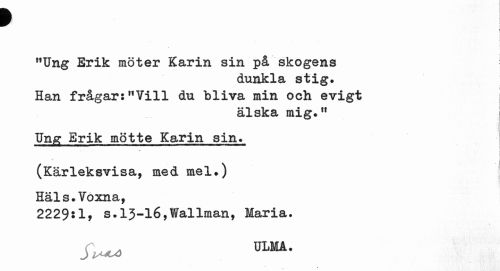 //// p //// - //// "Ung Erik möter Karin sin på skogens //// dunkla stig» //// Han frågar:"Vill du bliva min och evigt I //// älska mig." //// Ung Erik mötte Karin sin. //// (KärIekSviSa> mel.) Häls.Voxna, //// 2229:1, s.13-16,Wallman, Maria. ////