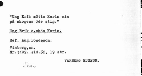 //// » i //// i //// "Ung Erik mötte Karin sin ' f //// på skogens öde stig." //// Ung Erik o.skön Karin. _ //// Ref. Aug.Bondeson. |= //// i s //// Vinberg,sn. ' //// Nr.3492. sid.62, 19 str. //// VARBERG MUSEUM. I //// I //// I //// [ ////