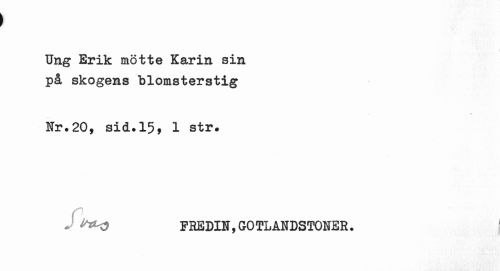 //// Ung Erik mötte Karin sin på skogens blomsterstig //// Nr.20, sid.15, 1 str. //// J FREDIN,GOTLANDSTONER. ////