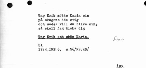 //// Ung Erik mötte Karin sin på skogens öde stig och sade: vill du bliva min, så skall jag älska dig //// Ung Erik och skön Karin. //// SA //// 19:4,INE 6, s.56/Nr.48/ //// ÅBO. ////