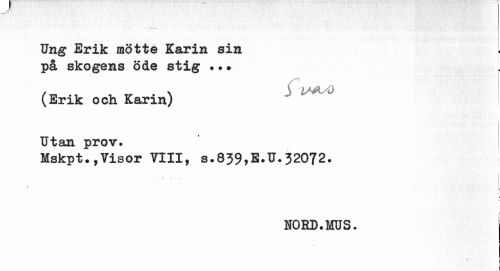 //// Ung Erik mötte Karin sin på skogens öde stig ?. • //// (Erik och Karin) //// i //// Utan prov. //// Mskpt.,Visor VIII, s.839,E.U.32072. //// 1 . //// / //// NORD.MUS. //// I //// i a ////