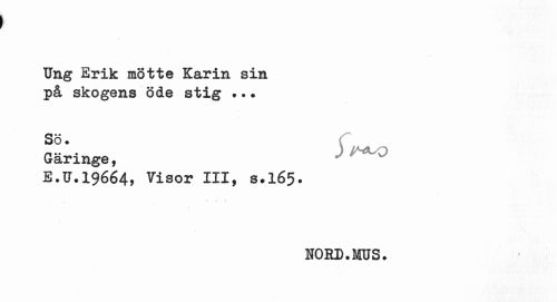 //// Ung Erik mötte Karin sin på skogens öde stig ..? //// Sö. //// Garinge, //// E.U.19664, Visor III, S.I65. //// HORD.MUS. ////