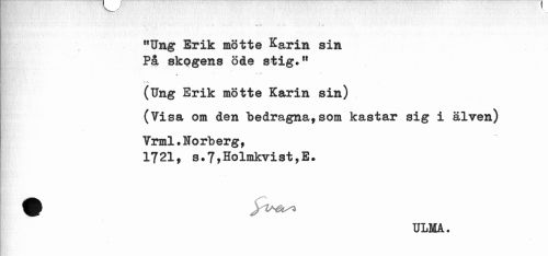 //// "Ung1 Erik mötte Karin sin På skogens öde stig»11 //// •k Mlé * //// \ //// •s .'V, //// (Ung Erik mötte Karin sin) //// (Visa om den "bedragna, som kastar sig i älven) //// Vrml. Norberg, //// 1721, s.7*Holmkvist,E. //// ULMA., ////