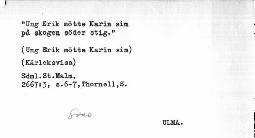//// « //// f,Ung Erik mötte Karin sin //// ¦ ¦ //// på skogen söder stig*" //// (Ung Erik mötte Karin sin) //// (Kärleksvisa) //// Sdml.St.Malm, //// 2667:3, s.6-79Thornell,S. //// ! //// I //// ULMA. | //// ¦ //// E //// ! ////
