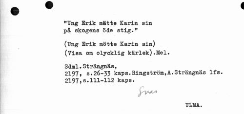//// "Ung Erik mätte Karin sin på skogens öde stig." //// (Ung Erik mötte Karin sin) (Visa om olycklig kärlek).Mel. //// Sdml.Strängnäs, //// 2197, s.26-33 kaps.Ringström,A.Strängnäs Ifs. 2197,s.111-112 kaps. //// ULMA. ////