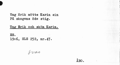 //// * //// Ung Erik mötte Karin sin På skogens öde stig. //// Ung Erik och skön Karin. //// > //// ES. //// 19:6, SLS 252, nr.47. //// i //// JhsrZ* //// ÅBO. //// .1 ////