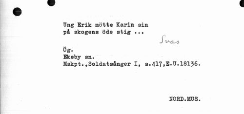//// Ung Erik mötte Karin sin på skogens öde stig •.. //// J WxX) //// Ög. //// Ekeby sn» //// Mskpt*,Soldatsånger I, //// IORD.MUS. ////