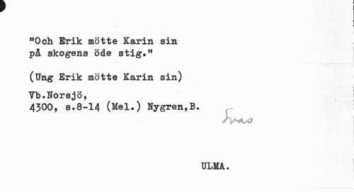 //// r' r //// 4 ' ! ^ //// < //// "Och Erik mötte Karin sin på skogens öde stig.*1 //// i //// (Ung Erik mötte Karin sin) Vb.Norsjö, //// 4300, s.8-14 (Mel*) Hygren,B. //// % //// ULMA. ////