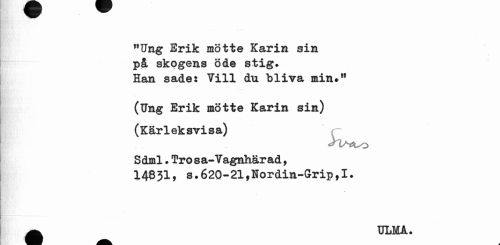 //// "Ung Erik mötte Karin sin //// på skogens öde stig» //// Han sade: Vill du bliva min»" //// (Ung Erik mötte Karin sin) (Kärleksvisa) //// Sdml•Tro sa-Vagnhärad, //// 14831, s•620-21,Hordin-Grip,I? //// ^ ULMA. ////