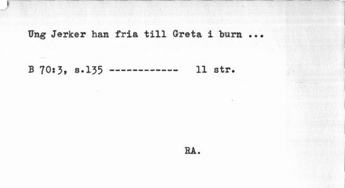 //// Ung Jerker han fria till Greta i btarn . • ? //// i //// B 70:3, s.135--- 11 str. //// 1 //// 1 //// t //// J //// RA. ////