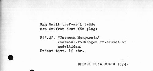 //// Ung Marit trefvar i trade hon drifver Sket för plog: //// Sid.42, "Juvenca Margareta" //// Yestmanl.folksägen fr.slutet af medeltiden. Endast text. 12 str# //// DYBECK RUNA POLIO 1874- ////