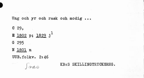 //// f 1 //// ¦ //// Ung och yr ooh rask och modig ... //// C 29, //// E 1802 p; 1829 j1 //// G 295 //// N 1801 n UUB.folkv. 2:46 //// KB:S SKILLINGTRYCKSREG. //// J sy-dsQ ////