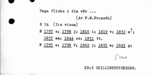 //// % //// Unga flicka i din vår ... ^^ (Av F.M.Franzén) //// ^^ B 24 (2:a visan) //// E 1797 a; 1798 jj 1810 i; 1812 r; 1852 m3; //// 1837 aa; 1844 00; 1851.tt, N 1125. 1798 f; 1802 jj 1821 1845 g; //// KBsS SKILLINGTRYCKSREG. //// • (• • . ' ' •• 1 - //// •a •• <V ////