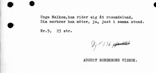 //// .. . .. . . ... » //// *- //// Unga Malkom,han rider sig åt ro sande lund, //// • Sin morbror han möter, ja, just i samma stund. //// Hr.9, 23 str. //// g A 3 3é //// AUGUST BONDESONS VISBOK. //// 1 T H S ////