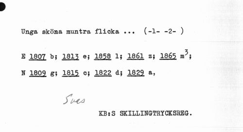 //// w //// Unga sköna muntra f X il ok d* • ? # (-1- -2- ) //// E 1807 b; 1815 ej 1858 1; 1861 z; 1865 m5; N 1809 g; 1815 o; 1822 d; 1829 a, //// KB:S SKILLINGTRYCKSEEG-. ////