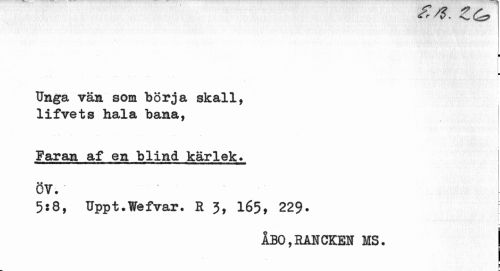 //// 'v . K* //// i //// i //// Unga vän som börja skall, lifvets hala bana, //// Faran af en blind kärlek. ÖV. //// 5:8, Uppt.Wefvar. R 3, 165, 229. //// ÅBO,RANCKEN MS. | //// u //// £ ////