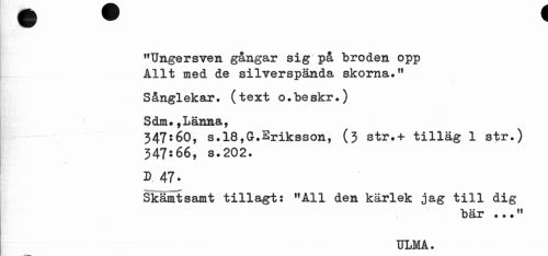 //// "Ungersven gångar sig på bröden opp Allt med de silverspända skorna»rf //// Sånglekar, (text o.beskr.) //// Sdm.,Länna, //// 347:60, s.18,G.Eriksson, (3 str.+ tillag 1 str.) 347:66, s.202. //// D 47 . //// Skämtsamt tillagt: "All den kärlek jag till dig //// bär ..." //// ULMA. ////