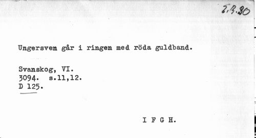 //// 7, //// ; //// t r //// Ungersven går i ringen med röda guldband. //// Svanskog, VI. 3094. s.11,12. //// D 125. //// 1— //// IFGH. | ////