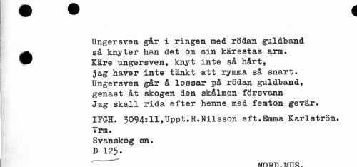 //// i . v . . //// Ungersven går i ringen med rödan guldband //// •så knyter han det om sin kärestas arm. //// Käre ungersven, knyt inte så hårt, //// jag haver inte tänkt att rymma så snart. //// Ungersven går å lossar på rödan guldband, //// genast åt skogen den skålmen försvann //// Jag skall rida efter henne med femton gevär. //// IPGH. 3094:11,Uppt.R.Nilsson eft.Emma Karlström. Vrm. //// Svanskog sn. //// D 125 • ////