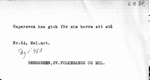 //// é, O t //// • l //// Ungersven han gick för sim herre att stå //// c t i //// Nr.64, Mel.mot. //// ^ftr* [ //// BERGGREEN,SV.FOLKESANGE OG MEL. //// i //// ! ////