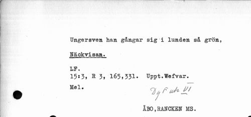 //// iv Jf '.'•--, '.« //// ¦ //// \ V //// Ungersven han gångar sig i lunden så grön, //// • • • //// Häckvisan* LP. //// 15*3, R 3, 165,331. Uppt.Wefvar. ^ Mel* % fi**' //// ÅBO,RAHCKEN MS. ////