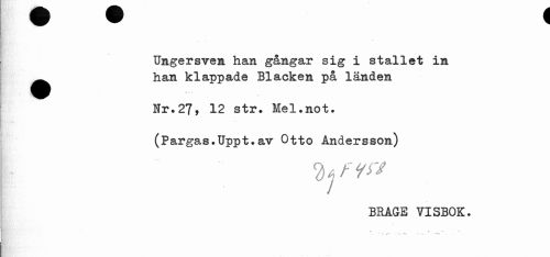 //// m v //// Ungersvem han gångar sig i stallet in ^^ han klappade Blacken på länden //// Nr.27, 12 str. Mel.not. //// (Pargas.Uppt.av Otto Andersson) //// BRAGE VISBOK. //// % i-• 'i • — . ////