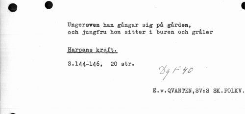 //// Ungersven han gångar sig på gården, och jungfru hon sitter i buren och gråler //// Harpans kraft. //// S.144-146, 20 str. //// 2<f /'t* ' //// E.v.QVANTEN,SV:S SK.FOLKV. //// i - ////