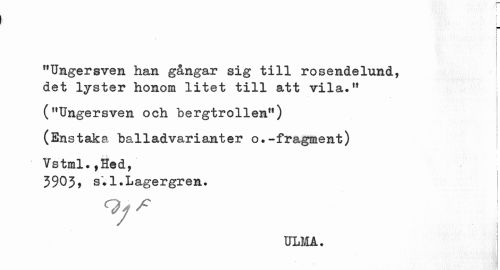//// I //// "Ungersven han gångar sig till rosendelund, det lyster honom litet till att vila." //// ("Ungersven och bergtrollen") //// (Enstaka balladvarianter o.-fragment) //// Vstml.,Hed, //// 3903f s •1•Lagergren. //// ULMA. ////
