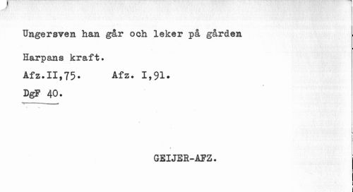 //// Ungersven han går och leker på gården //// Harpans kraft. Åfz.II,75. Afz. 1,91. //// % //// DgF 40. //// ¦¦¦ 1 i //// ¦ //// / //// 1 //// * //// GEIJE1-ÅFZ. j //// C ¦ //// ! //// ¦ //// I //// i ¦ //// I ////