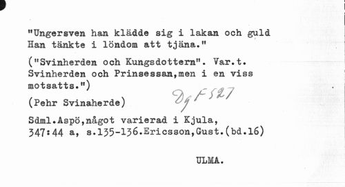 //// "Ungersven han klädde sig i lakan och guld Han tänkte i löndom att tjäna." //// - //// ("Svinherden och Kungsdottern". Var.t. //// Svinherden och Prinsessan,men i en viss | //// motsatts.") //// (Pehr Svinaherde) //// Sdml.Aspö,något varierad i Kjula, //// 347:44 a, s.135-136.Ericsson,Gust.(bd.16) //// ULMA. ////