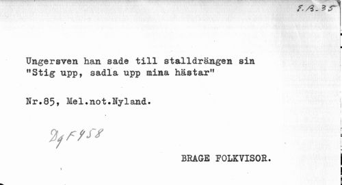 //// & r / m~ IS //// ¦ //// ¦ //// Ungersven han sade till stalldrängen sin "Stig upp, sadla upp mina hästar" //// » //// Nr.85, Mel.not.Nyland. j //// j //// j //// BRAGE FOLKVISOR. | ////