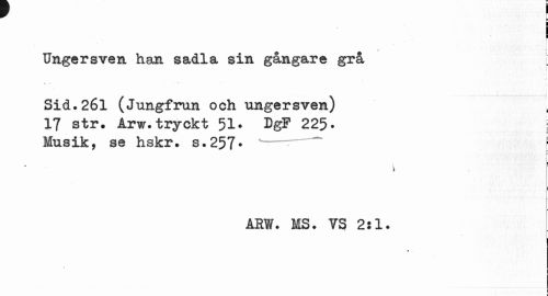 //// r //// s t //// Ungersven, han sadla sin gångare grå i //// \ f //// Sid.261 (Jungfrun och ungersven) \ //// 17 str. Arw.tryckt 51. DgF 225• //// Musik, se hskr. s.257* 5 //// f 1 1 //// \ //// ARW. MS. YS 2:1. //// # , //// s ////