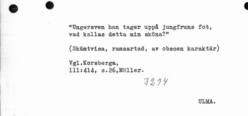 //// ? //// "Ungersven han tager uppå jungfruns fot, vad kallas detta min sköna?" //// (Skämtvisa, ramsartad, av obscen karaktär) //// Ygl.Korsberga, 111:414* s.26,Möller. //// un //// ULMA. //// « ////
