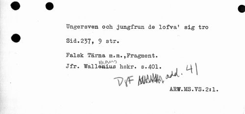 //// Ungersven och jungfrun de lofvaf sig tro //// ® Sid.237* 9 str. //// Falsk Tärna m#m.,Fragment. //// Jfr. Wallsnius hskr. s.401. {j^ \ //// ARW.MS.VS.2il. ////