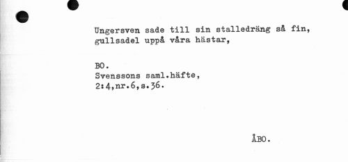 //// Ungersven sade till sin stalledräng så fin, gullsadel uppå våra hästar, //// BO. //// Svenssons saml.häfte, //// 2:4,nr.6, s. //// ÅBO. ////