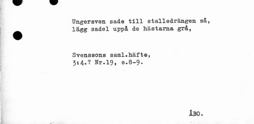 //// Ungersven sade till stalledrängen så, //// •lägg sadel uppå de hästarna grå, //// i //// Svenssons saml.häfte, //// 3:4.? Hr.19, s.8-9- //// r //// Krm' / //// ¦ //// B® "' //// ÅBO. ////