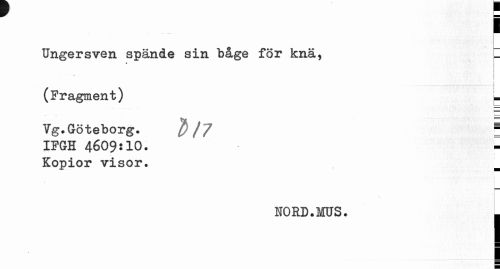 //// r u //// Ungersven spände sin båge för k nä, f //// ? //// (Fragment) u //// Vg.Göteborg. / // J IFGH 4609:10. Kopior visor. //// NORD.MUS. | //// ¦ ////