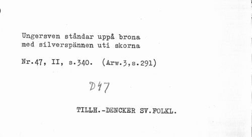 //// I //// v f //// Ungersven ståndar uppå brona //// med silverspännen uti skorna //// • • //// Nr.47, II, s.340. (Arv?.3 ? s. 29l) //// D17 //// > //// TILLH.-DENCKER SV.POLKL. //// 1 ////