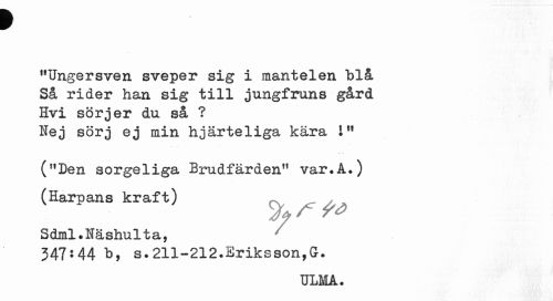 //// f //// "Ungersven sveper sig i mantelen blå Så rider han sig till jungfruns gård Hvi sörjer du så ? Nej sörj ej min hjärteliga kära iH //// ("Den sorgeliga Brudfärden11 var.A.) (Harpans kraft) //// Sdml.Näshulta, //// 347*44 b, s.211-212.Eriksson,ff. //// ULMA. ////