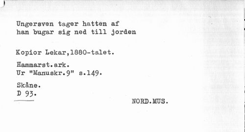 //// » //// I //// Ungersven tager hatten af han bugar sig ned till jorden //// i //// i ¦ //// > //// l //// Kopior Lekar,1880-talet. i //// : //// Hammarst.ark. //// Ur "Manuskr.9" s.149* Skåne. //// D 93- //// --NORD.MUS. ////