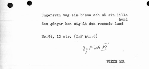 //// - //// Ungersven tog sin bössa och så sin lilla //// hund //// Sen gångar han sig åt den rosende lund //// ¦ //// Nr.96, 12 str. (DgP fctr.6) //// ^jr-uAw //// WIEDE MS. ////