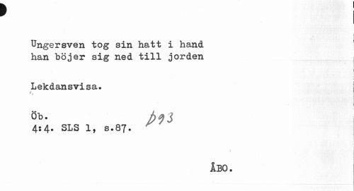 //// t //// Ungersven tog sin hatt i hand //// han böjer sig ned till jorden i //// i //// Lekdansvisa. [ //// i //// Öb. h^l 4:4. SLS 1, s.87. ^ //// 1 : //// i //// ÅBO. ////