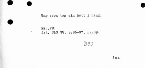 //// Ung sven tog sin hatt i hand, //// EE • 9 PS • //// 4:4, SLS 35, s.96-97, nr.89. //// D13 //// ÅBO. ////