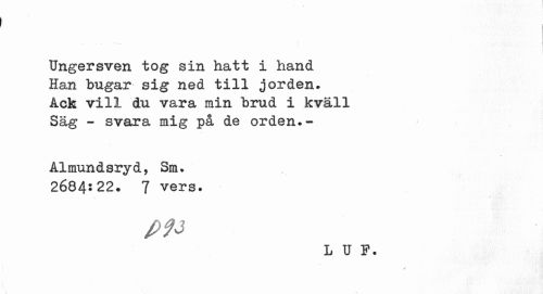 //// ... //// Ungersven tog sin hatt i hand Han bugar sig ned till jorden. Ack vill du vara min brud i kväll Säg - svara mig på de orden.- //// Almundsryd, Sm. 2684:22. 7 vers. //// L U F. ////
